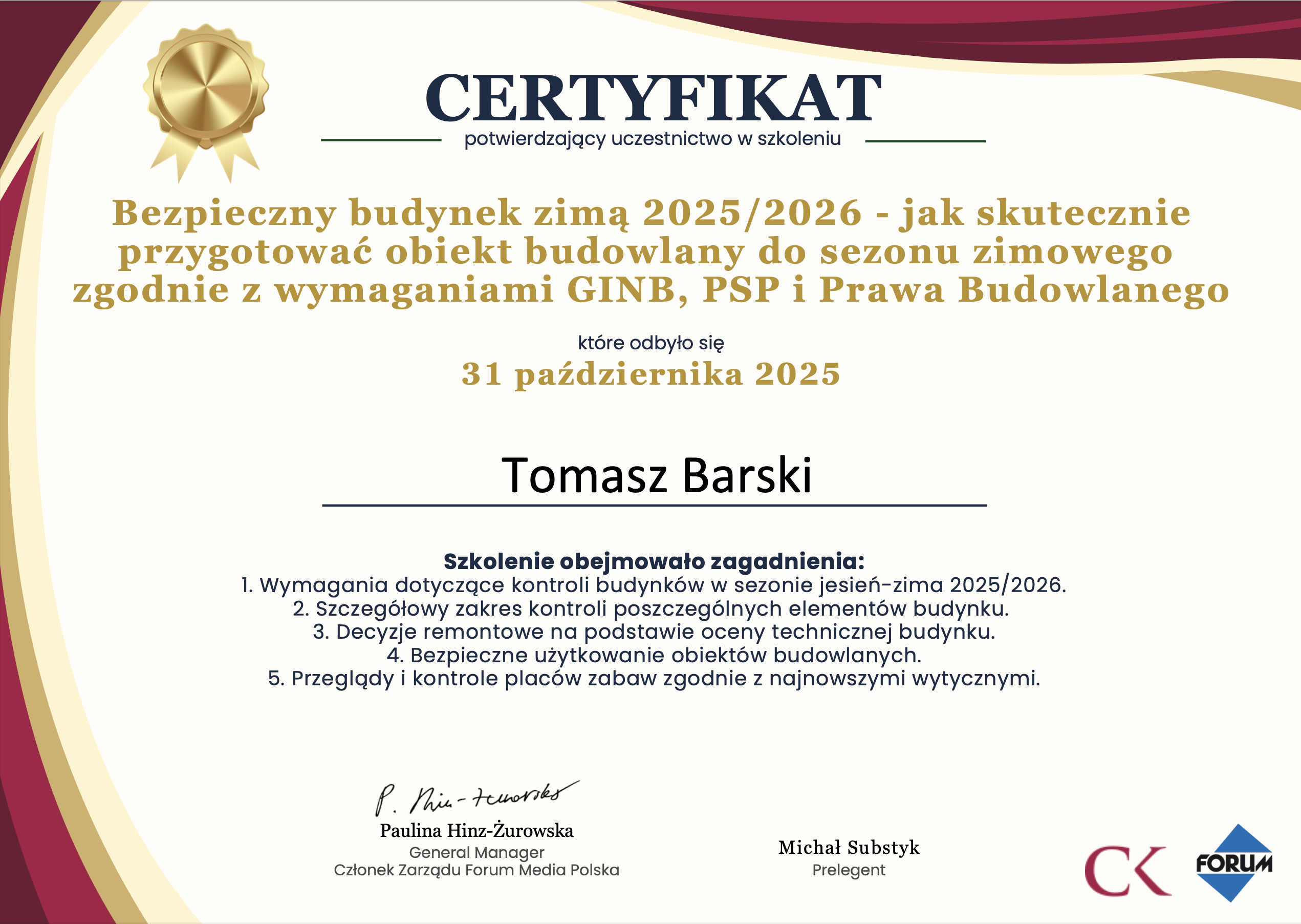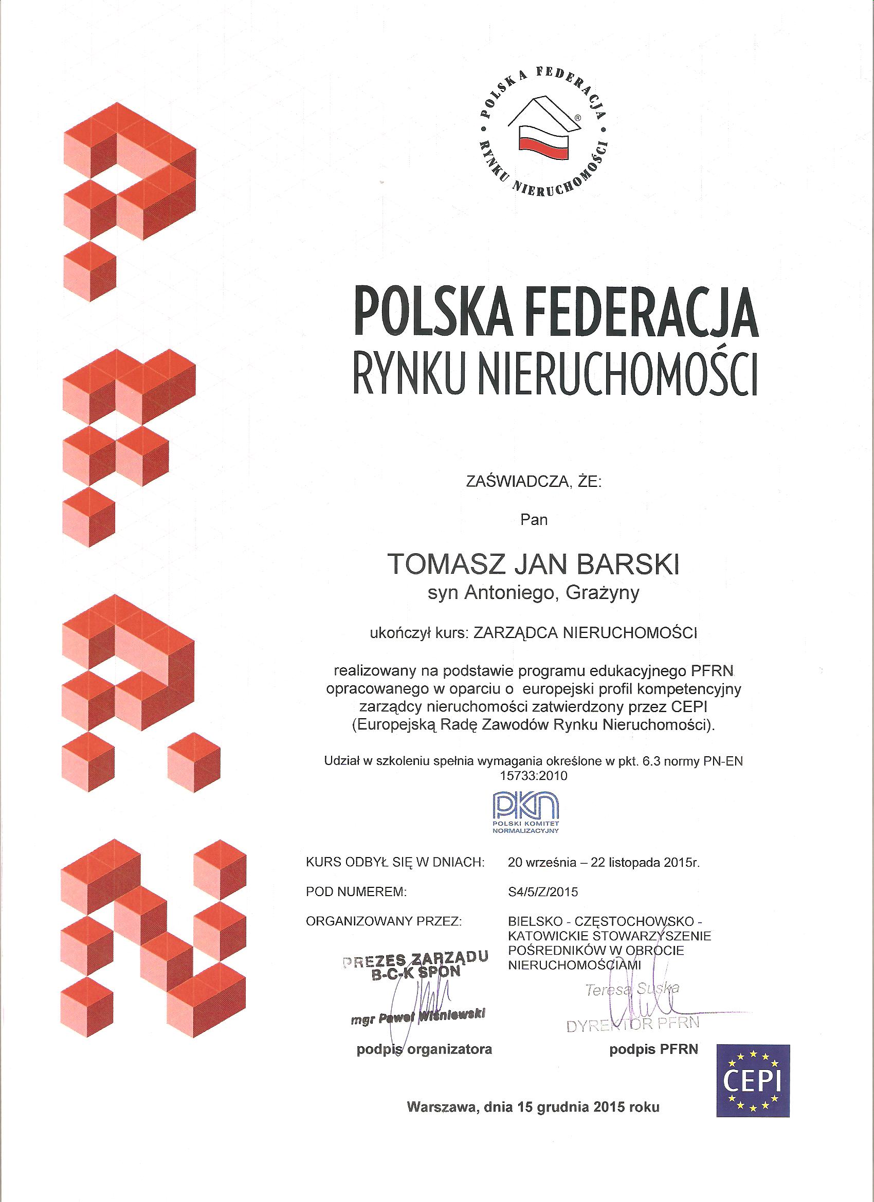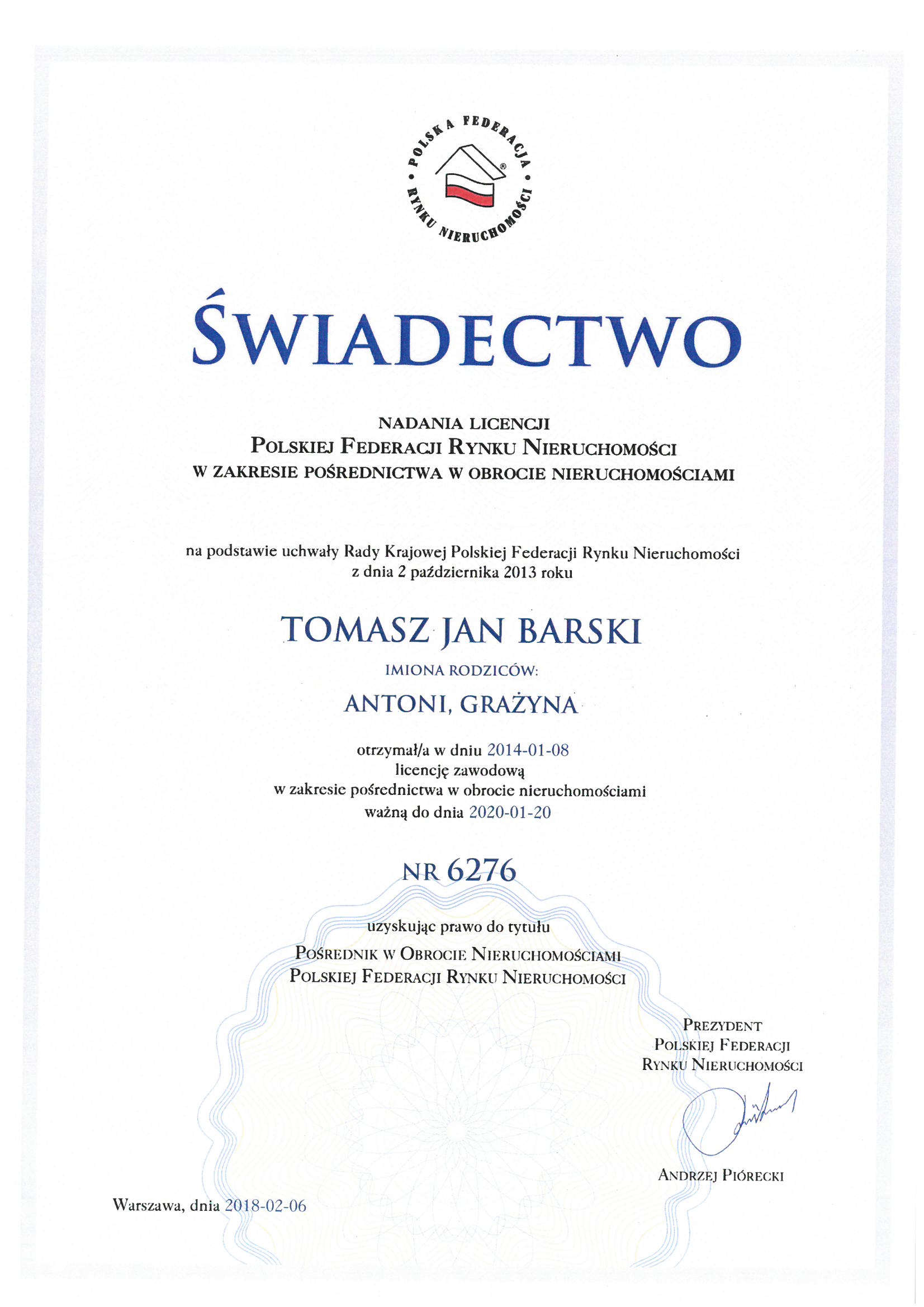 Aby zdobyć solidne fundamenty, ukończyłem studia podyplomowe z gospodarowania nieruchomościami i w pierwszym możliwym terminie zdałem państwowy egzamin teoretyczny oraz praktyczny w Ministerstwie Infrastruktury w Warszawie, uzyskując licencję Pośrednika w obrocie nieruchomościami nr 6276.